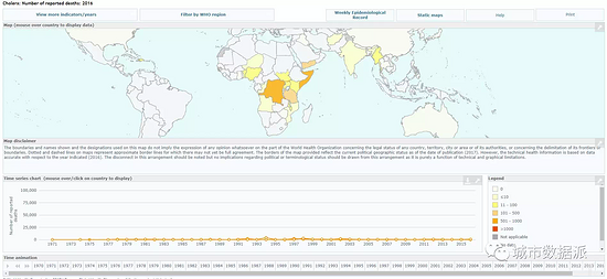 上圖是一個(gè)對(duì)世衛(wèi)組織統(tǒng)計(jì)的霍亂爆發(fā)數(shù)據(jù)的可視化案例,這里用到了定制化的插圖和色彩方案來(lái)呈現(xiàn)效果。