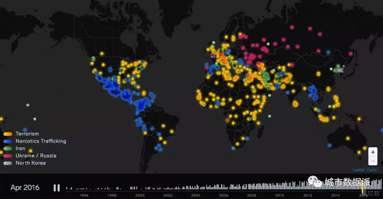 Enigma Labs公司在今年早些時(shí)候發(fā)布了世界上第一個(gè)制裁數(shù)據(jù)追蹤器項(xiàng)目,它將美國(guó)20年間的(對(duì)外)制裁數(shù)據(jù)作為有意義的信息聯(lián)系起來(lái)理解,講述了一個(gè)數(shù)據(jù)故事。2018年,我們期待可以看到更多的利用地圖和其他數(shù)據(jù)可視化媒介手段呈現(xiàn)的數(shù)據(jù)體驗(yàn),以便來(lái)溝通復(fù)雜的社會(huì)議題。