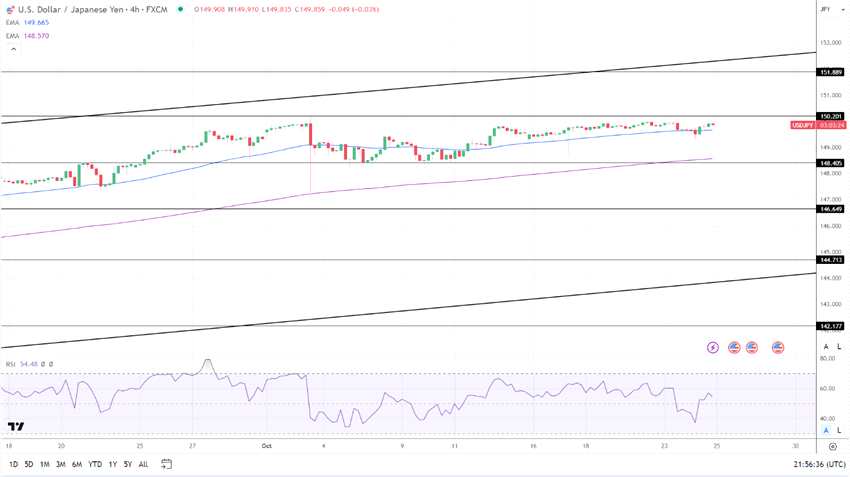 周三(10月25日)亞市早盤(pán),美元/日元繼續(xù)在149.88附近盤(pán)旋,顯示交易員難逃日本央行在150關(guān)口出手干預(yù)匯市的威脅。但市場(chǎng)分析展望,周五情況可能會(huì)發(fā)生變化,美國(guó)通脹成為焦點(diǎn),可能將打破匯市僵局,在進(jìn)入超買(mǎi)區(qū)域前,帶領(lǐng)美元/日元升破150門(mén)檻。