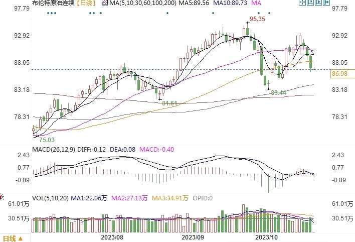 布倫特原油連續(xù)日線圖北京時(shí)間10月25日13:40 布倫特原油連續(xù) 報(bào) 86.92 美元/桶