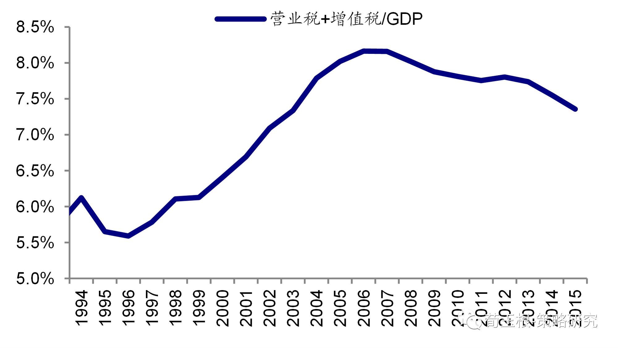 從宏觀稅收的角度可以側(cè)面反映稅率的變化,我們用財(cái)政收入中營(yíng)業(yè)稅加增值稅總額占GDP的比重當(dāng)作營(yíng)業(yè)稅和增值稅的宏觀稅率。04年之前,隨著征收水平的提高以及優(yōu)惠稅率的較少,營(yíng)業(yè)稅加增值稅占GDP的比重逐年升高;08年我國(guó)第一次增值稅改革進(jìn)入尾聲,占比開(kāi)始下降;此后12年開(kāi)始營(yíng)改增,宏觀稅率再次下降。