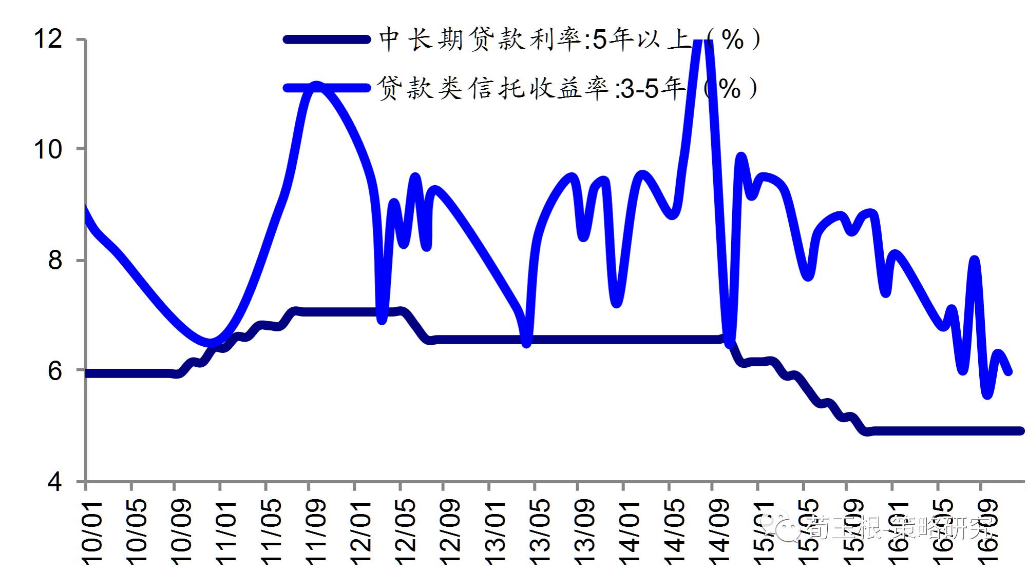 11年至今,我國(guó)經(jīng)濟(jì)持續(xù)下行,制造業(yè)盈利水平逐年降低,我們用剔除投資凈收益的ROIC以及ROE代表企業(yè)的盈利水平,可以看到ROIC從10年的8.0%下降到16Q1的4.5%,ROE從10年9.8%下降至15年的3.6%。16年來(lái),兩者雖然有所回升,但仍然處于較低水平,16Q3分別為4.8%和4.5%。期間企業(yè)財(cái)務(wù)負(fù)擔(dān)方面也有所下降,我們用銀行貸款利率和信托利率代表企業(yè)財(cái)務(wù)成本,可見(jiàn)在央行不斷的降息下,5年以上銀行貸款利率從12年的7.05%下降215Bp至目前的4.9%,3-5年期信托貸款從11年的11.15%下降515Bp至目前的6.0%。
