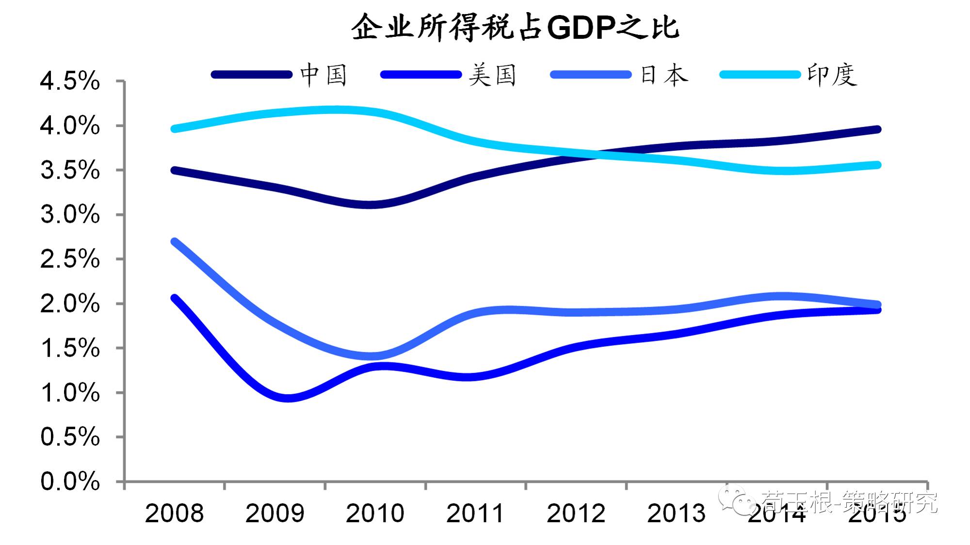 從宏觀的稅負(fù)率角度看,我國(guó)財(cái)政收入企業(yè)所得稅占GDP的比重較高,2015年為4%,而美國(guó)為1.9%、日本為2.0、印度為3.6%,單就企業(yè)所得稅一項(xiàng)在整個(gè)宏觀經(jīng)濟(jì)的比重就已經(jīng)較高。