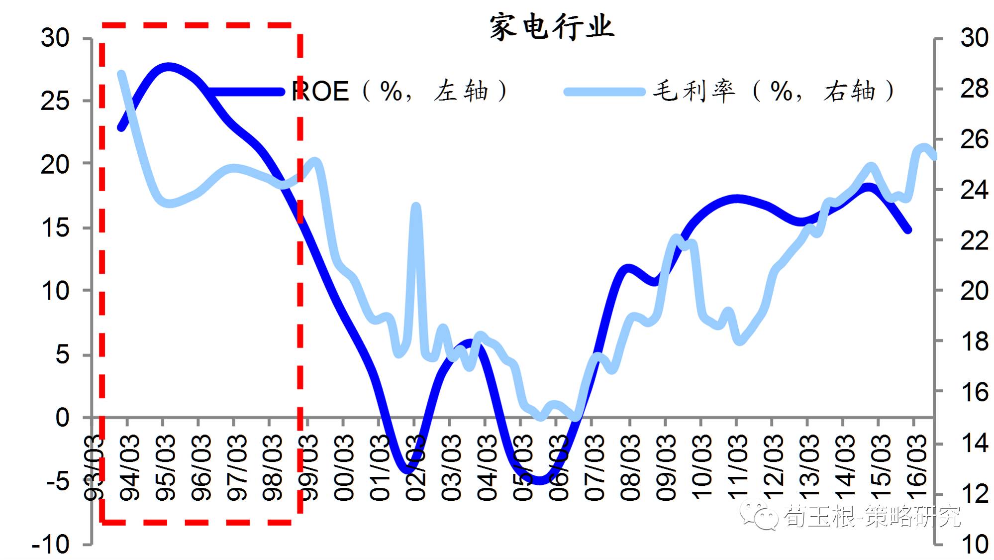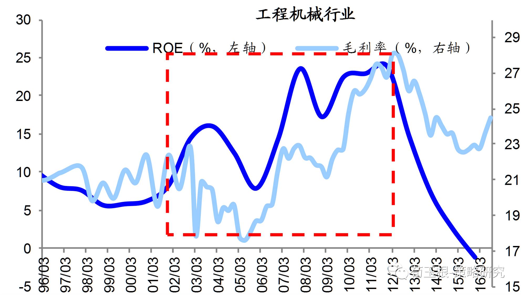 以上市公司為樣本,可以看出制造業(yè)的輪動(dòng)情況。消費(fèi)制造時(shí)代的代表家電行業(yè)在90年代ROE和毛利率均保持較高水平,最高分別為27.4%和28.5%,01-05年ROE跌至0附近,毛利率最低也下滑至15%。而工業(yè)制造時(shí)代的代表工程機(jī)械行業(yè),其ROE和毛利率水平從02年開(kāi)始震蕩上行,一直到11年底見(jiàn)頂開(kāi)始下滑。