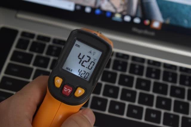 實(shí)測(cè)在玩大型游戲的時(shí)候,榮耀鯊魚(yú)鰭散熱風(fēng)扇的聲音很小,發(fā)熱的區(qū)域主要集中在鍵盤(pán)頂部和屏幕轉(zhuǎn)軸的部分,最高溫度42℃(室溫25℃),整體溫度控制比較理想,配合鋁合金的金屬,散熱速度十分快。