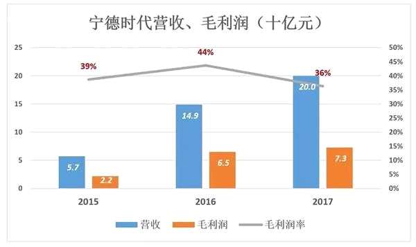 2017年,寧德時(shí)代營(yíng)收接近200億,同比增長(zhǎng)34.4%,遠(yuǎn)遠(yuǎn)不及2016年的161%,亦低于2017年中國(guó)新能源車(53.3%)的增速。