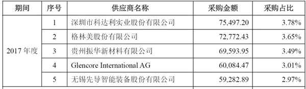 制造動(dòng)力電池的所有材料都是外購(gòu)的。2017年,寧德時(shí)代從五大供應(yīng)商采購(gòu)金額達(dá)33.7億。