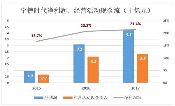從凈利潤(rùn)、凈利潤(rùn)率及經(jīng)營(yíng)活動(dòng)現(xiàn)金流入凈額看,寧德時(shí)代無(wú)疑是績(jī)優(yōu)股。2017年凈利潤(rùn)率、經(jīng)營(yíng)活動(dòng)現(xiàn)金流入凈額分別為43億和23億,凈利潤(rùn)率21.4%。