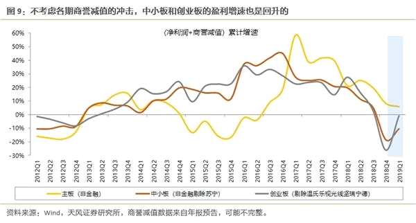 最后,若我們把各期的商譽(yù)減值加回凈利潤(rùn)再計(jì)算同比增速,結(jié)果顯示(如圖表9):中小板和創(chuàng)業(yè)板的盈利增速也是回升的,但主板增速小幅下滑(主板18年年報(bào)受商譽(yù)減值的沖擊要較小)。說明中小創(chuàng)內(nèi)生增速可能也已見底回升。
