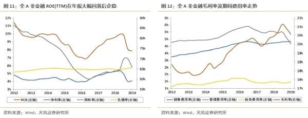 與上文結(jié)論一致,全A非金融ROE(TTM)在18Q4斷崖式下滑后,19Q1企穩(wěn),其主要的推動(dòng)力來自管理費(fèi)率的下降,帶來的凈利率回升;但周轉(zhuǎn)率與負(fù)債率指標(biāo),均有所惡化,特別是周轉(zhuǎn)率。