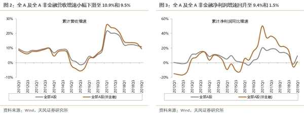 全A及全A非金融營(yíng)收增速小幅下滑至10.9%和9.5%,但凈利潤(rùn)增速回升至9.4%和1.5%。全A及全A非金融19Q1營(yíng)收增速分別為10.9%和9.5%,較18Q4的11.7%和13.0%下滑0.8pct和3.5pct;但是凈利潤(rùn)增速卻有明顯的提升,分別為9.4%和1.5%,較18Q4的-2.0%和-5.6%大幅回升11.4pct和7.1pct。營(yíng)收增速回落但凈利潤(rùn)增速在提升,直觀體現(xiàn)是需求下滑的同時(shí)盈利能力卻有所提升。