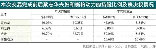公司創(chuàng)始人蔡志華夫婦在本次交易完成前,共持有公司66.72%的股份及相應(yīng)的表決權(quán)。轉(zhuǎn)讓給衡帕動力16.68%的公司股份和放棄41.20%股份的表決權(quán)之后,蔡志華夫婦仍擁有公司50.04%的股份和8.84%表決權(quán),而衡帕動力則因?yàn)閾碛?6.68%的表決權(quán)而成為單一擁有公司股份表決權(quán)份額最大的股東,由于公司其他股東的持股比例均未超過5%,衡帕動力能夠?qū)镜墓蓶|大會決議產(chǎn)生重大影響。