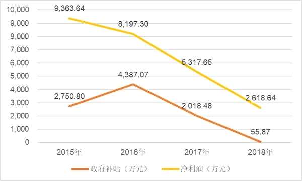 2015年至2018年,佐力藥業(yè)分別獲得政府補(bǔ)貼2750.8萬元、4387.07萬元、2018.48萬元、55.87萬元,同期凈利潤分別為9363.64萬元、8197.3萬元、5317.65萬元、2618.64萬元。