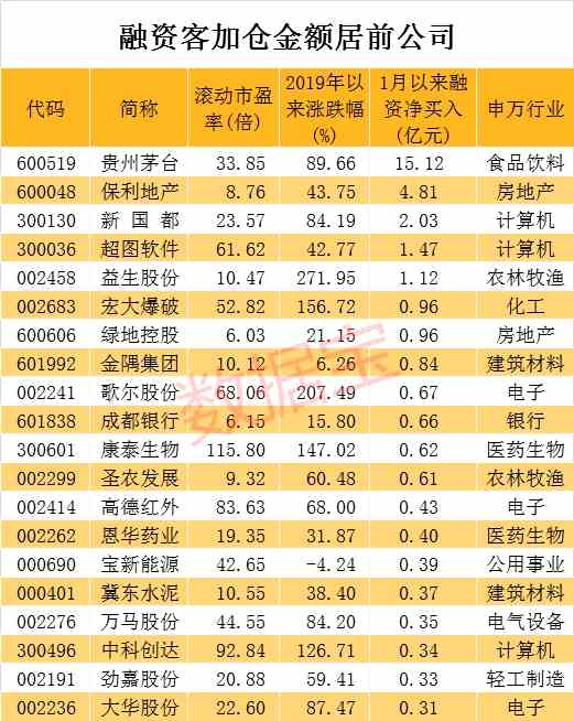 與北上資金一樣,融資客在過(guò)去一年頻繁出手,開年之后節(jié)奏不停。開年以來(lái)融資客累計(jì)凈買入已達(dá)到246.64億元。上述61股中,部分股票獲得融資客大手筆加倉(cāng)。數(shù)據(jù)寶統(tǒng)計(jì)顯示,在短短6個(gè)交易日內(nèi),5股獲融資客凈買入超億元,分別是貴州茅臺(tái)、保利地產(chǎn)、新國(guó)都、超圖軟件、益生股份。白酒行業(yè)龍頭貴州茅臺(tái)獲融資客凈買入額最高,為15.12億元。