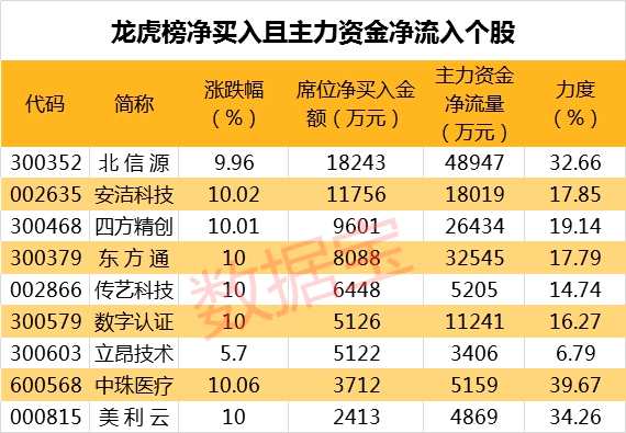 從盤口資金流向來(lái)看,主力資金凈流入超五千萬(wàn)且龍虎榜凈買入個(gè)股共有10只,其中北信源、東方通、四方精創(chuàng)等個(gè)股資金凈流入金額最大。凈流入力度最大的個(gè)股有大連友誼、模塑科技、中珠醫(yī)療,凈流入力度分別為62.71%、62.61%、39.67%。