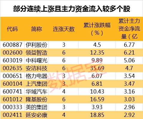 值得注意的是,271只連續(xù)上漲個(gè)股中,22只個(gè)股期間主力資金累計(jì)凈流入超過(guò)億元。其中,累計(jì)資金流入最多的為伊利股份,主力資金累計(jì)流入6.77億元。