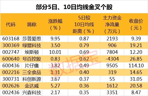 截至最新,有15只A股的5日均線主動(dòng)上穿10日均線,其中莎普愛思、綠盟科技、埃斯頓等個(gè)股的5日均線較10日均線距離最大,分別達(dá)0.87%、0.79%、0.69%。