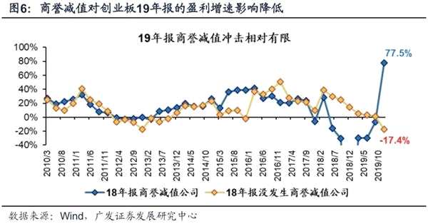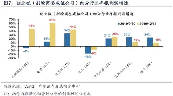 (2)在創(chuàng)業(yè)板中,剔除18年報+19年報發(fā)生商譽減值的公司(275家)后,創(chuàng)業(yè)板年報預(yù)告業(yè)績增速為6.1%,相對于三季報的-10.2%顯著抬升。