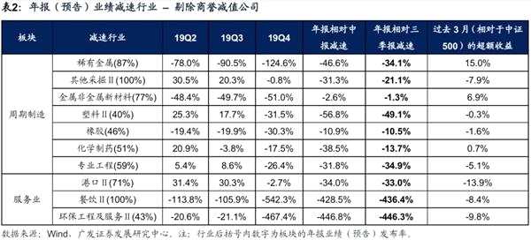 5、年報(預(yù)告)業(yè)績減速行業(yè):在全部A股中,剔除18年報+19年報發(fā)生商譽減值的公司(966家)后,我們篩選年報(預(yù)告)業(yè)績增速相對于三季報和中報均減速,且年報業(yè)績(預(yù)告)發(fā)布率在40%以上的二級行業(yè),主要分布在:周期制造(稀有金屬、其他采掘、金屬非金屬新材料、塑料、橡膠、化學(xué)制藥、專業(yè)工程)、服務(wù)業(yè)(港口、餐飲、環(huán)保工程及服務(wù))等領(lǐng)域。