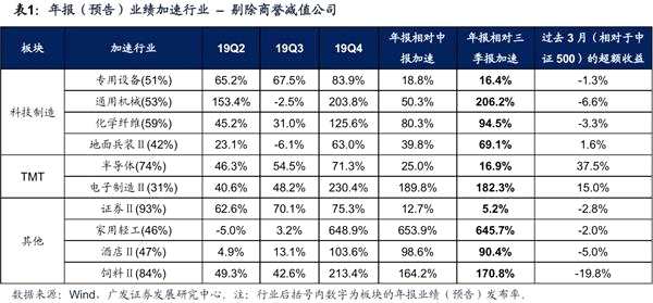 4、年報(預(yù)告)業(yè)績加速行業(yè):在全部A股中,剔除18年報+19年報發(fā)生商譽減值的公司(966家)后,我們篩選年報(預(yù)告)業(yè)績增速相對于三季報和中報均加速,且年報業(yè)績(預(yù)告)發(fā)布率在40%以上的二級行業(yè),主要分布在:科技制造(專用設(shè)備、通用設(shè)備、化學(xué)纖維、地面兵裝)、TMT(半導(dǎo)體、電子制造)等領(lǐng)域。