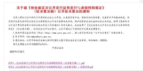 5月22日晚間,為做好創(chuàng)業(yè)板改革并試點(diǎn)注冊(cè)制工作,中國(guó)證監(jiān)會(huì)在總結(jié)近年來(lái)新股發(fā)行承銷制度改革,尤其是科創(chuàng)板試點(diǎn)注冊(cè)制改革實(shí)踐經(jīng)驗(yàn)的基礎(chǔ)上,結(jié)合創(chuàng)業(yè)板特點(diǎn),就創(chuàng)業(yè)板首次公開(kāi)發(fā)行證券發(fā)行與承銷特別規(guī)定公開(kāi)征求意見(jiàn)。