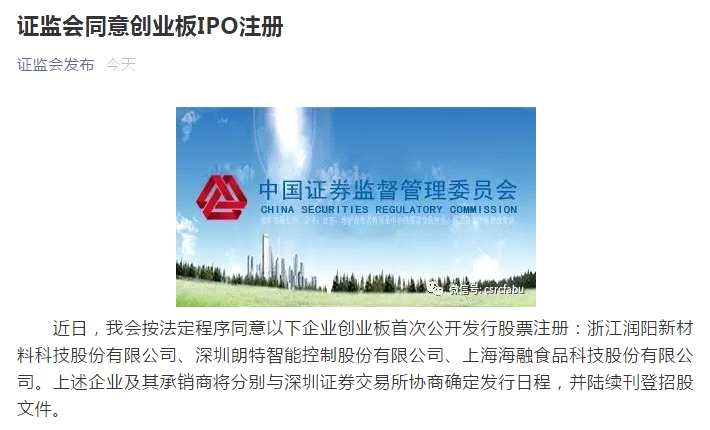 摘要: 近日,我會(huì)按法定程序同意以下企業(yè)創(chuàng)業(yè)板首次公開發(fā)行股票注冊(cè):浙江潤(rùn)陽新材料科技股份有限公司、深圳朗特智能控制股份有限公司、上海海融食品科技股份有限公司。