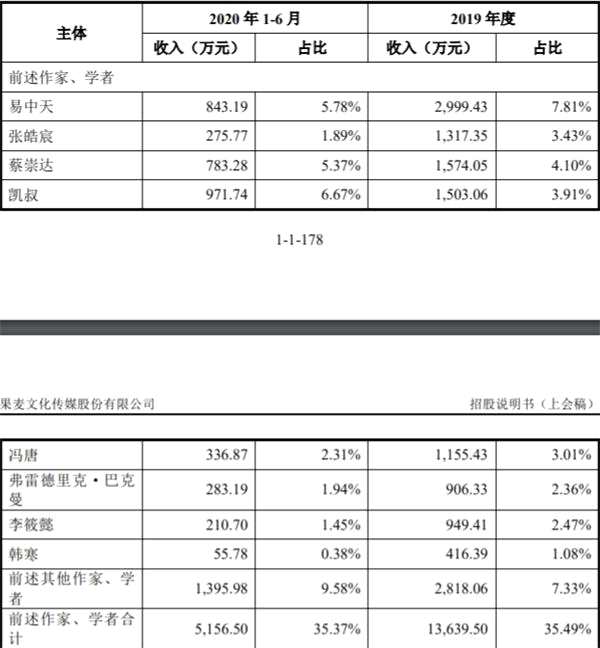 招股書(shū)披露,易中天系果麥文化合作作家中的絕對(duì)核心,其在2019年為公司帶來(lái)近3000萬(wàn)元收入,而韓寒同期僅貢獻(xiàn)416萬(wàn)元。