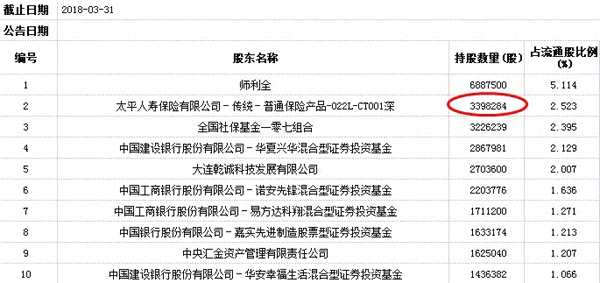 截至2018年3月31日,智云股份前十大流通股股東中,有一家保險(xiǎn)公司產(chǎn)品持股:太平人壽保險(xiǎn)有限公司-傳統(tǒng)-普通保險(xiǎn)產(chǎn)品-022L-CT001深,持股數(shù)量為339.83萬股,占流通股比例為2.523%。