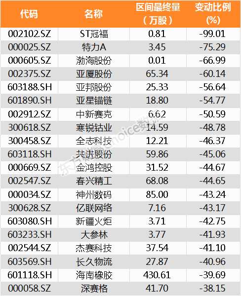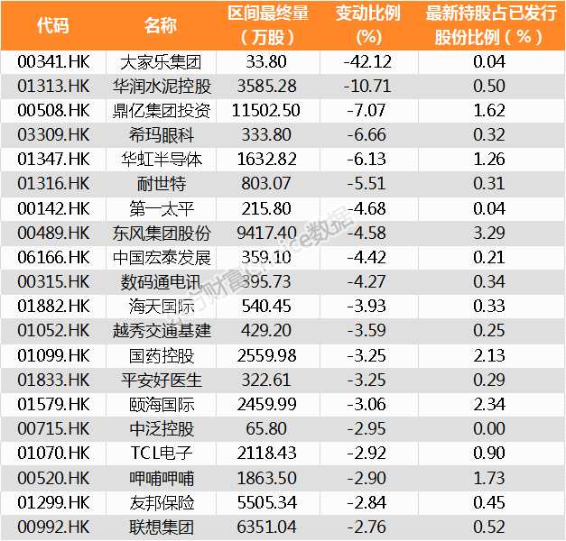 南向資金減持股份占其持股比例前20家公司名單: