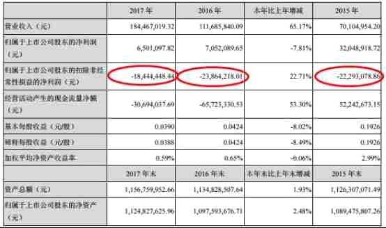 去年年報顯示,北京君正2015年至2017年的扣除非經(jīng)常性損益的凈利潤連續(xù)三年為負(fù),分別為-2229.31萬元、-2386.42萬元、-1844.44萬元。