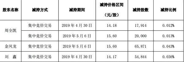 5月7日公告顯示,董事周全凱、董事金鳳龍、監(jiān)事劉鑫,自4月30日起至5月6日,因個人資金需要減持股份15.86萬股,占公司總股本的0.104%,占承諾減持股份數(shù)的39.042%。