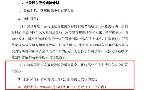 到了2016年7月,勁輝國際又開啟了新一輪減持,可能是為了讓減持更加順理成章,勁輝國際的減持理由還加上了一句:本次減持股份所得資金,將無息借給勁勝智能1-2億元使用,部分用于股東自身資金需求。