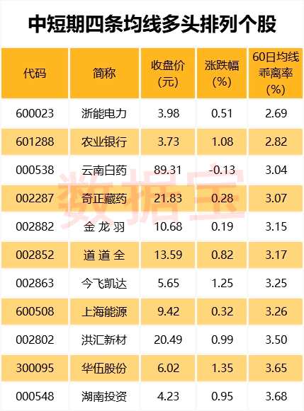 一般來(lái)說(shuō),均線多頭排列代表買方力量強(qiáng)大,后市由多方主導(dǎo)行情概率較大。449只個(gè)股5日、10日、20日、60日四條均線近日呈多頭排列。其中浙能電力、農(nóng)業(yè)銀行、云南白藥股價(jià)與60日均線的乖離率最小,分別為2.69%、2.82%、3.04%。