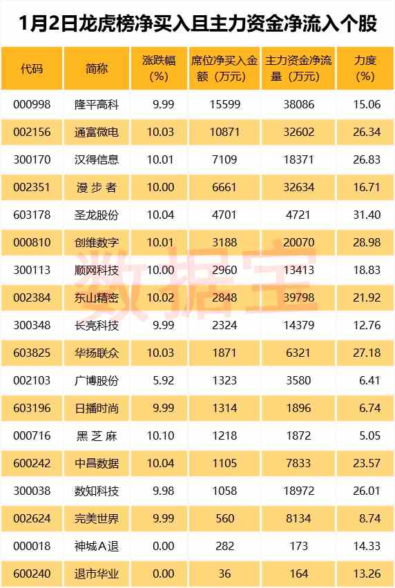 1月2日龍虎榜中機(jī)構(gòu)及營(yíng)業(yè)部席位資金凈賣出2.62億元,其中凈買入的個(gè)股有19只;凈賣出的個(gè)股有11只。凈買入前三名個(gè)股分別是隆平高科、通富微電、漢得信息等,凈買入金額占當(dāng)日成交額比例達(dá)6.17%、8.78%、10.38%。