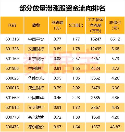 值得注意的是,304只放量滯漲股中,中國(guó)平安、交通銀行、北京銀行、中國(guó)銀行、華能水電等個(gè)股主力資金凈流入較多。