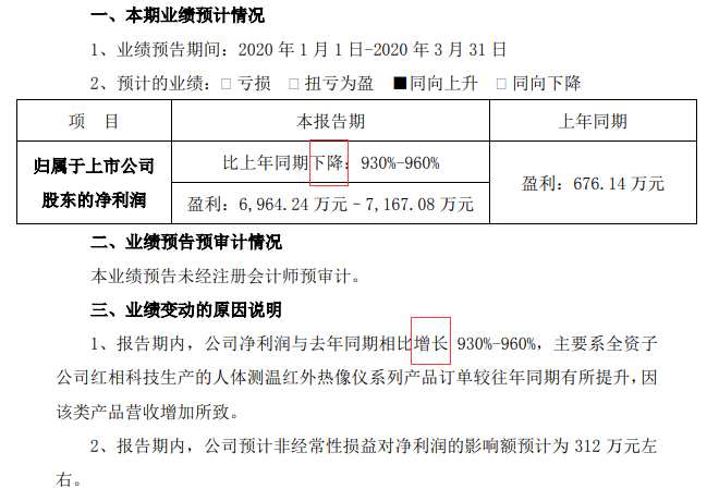 不過在業(yè)績變動說明中,金盾股份倒是寫對了,稱今年1~3月公司凈利潤預計與去年同期相比“增長”930%~960%,主要系全資子公司紅相科技生產(chǎn)的人體測溫紅外熱像儀系列產(chǎn)品訂單較往年同期有所提升,因該類產(chǎn)品營收增加所致。同時,公司預計非經(jīng)常性損益對凈利潤的影響額預計為312萬元左右。