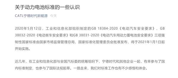 在與比亞迪幾次“隔空博弈”之后,5月25日,寧德時(shí)代(300750,SZ)官微發(fā)布《關(guān)于動(dòng)力電池標(biāo)準(zhǔn)的一些認(rèn)識(shí)》,列出三元和鐵鋰電池各有特點(diǎn),分別滿足不同市場(chǎng)的需求;國際認(rèn)知從單體安全轉(zhuǎn)向系統(tǒng)安全;中國標(biāo)準(zhǔn)與國際法規(guī)全面接軌,重心轉(zhuǎn)向系統(tǒng)安全等三點(diǎn)內(nèi)容,就備受外界關(guān)注的電池針刺測(cè)試再度回應(yīng)。
