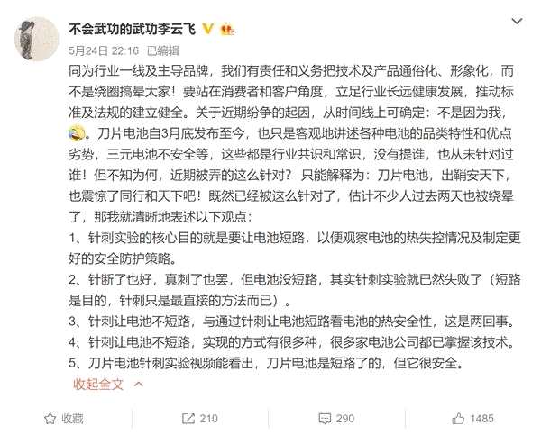對(duì)此,李云飛再次發(fā)微博回懟:“針斷了也好,真刺了也罷,但電池沒短路,其實(shí)針刺實(shí)驗(yàn)就已然失敗了”,并且表示“針刺讓電池不短路,與通過針刺讓電池短路看電池的熱安全性,這是兩回事;針刺讓電池不短路,實(shí)現(xiàn)的方式有很多種,很多家電池公司都已掌握該技術(shù)。”