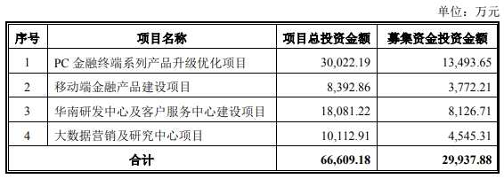 指南針上市時(shí)披露的公告書顯示,公司上市發(fā)行股份數(shù)量為5690.00萬(wàn)股,募集資金總額為3.56億元,扣除發(fā)行費(fèi)用后募集資金凈額為2.99億元,分別用于“PC 金融終端系列產(chǎn)品升級(jí)優(yōu)化項(xiàng)目”、“移動(dòng)端金融產(chǎn)品建設(shè)項(xiàng)目”、“華南研發(fā)中心及客戶服務(wù)中心建設(shè)項(xiàng)目”、“大數(shù)據(jù)營(yíng)銷及研究中心項(xiàng)目”。