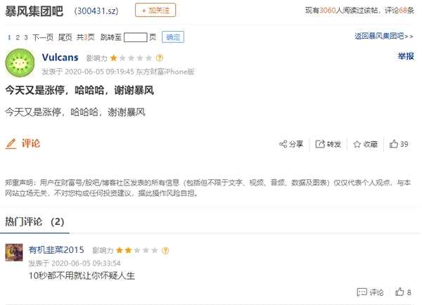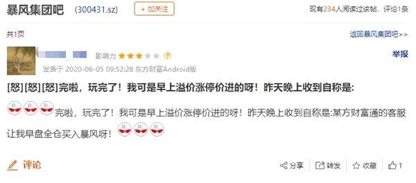 “今天又是漲停,哈哈哈,謝謝暴風(fēng)!”——“10秒都不用就讓你懷疑人生……”兩名股民在股吧一前一后的對話,正反映出6月5日暴風(fēng)集團股價走勢的玄幻。