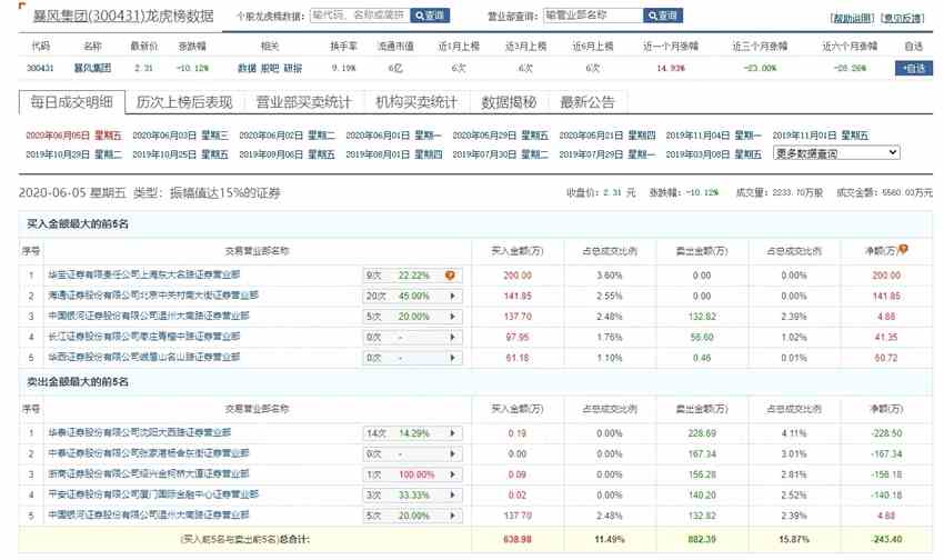 由于當(dāng)日振幅超過15%,暴風(fēng)集團在6月5日再次登上龍虎榜。信息顯示,多筆游資正在抄底買入暴風(fēng)集團,買入前五營業(yè)部中前三均為游資。買入前五合計金額638.98萬元,占總成交11.49%;賣出前五合計882.39萬元,占總成交15.87%。