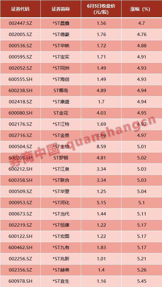 即便如此,仍有多只ST股股價處于回光返照的階段。僅6月5日當(dāng)日,就有24只ST股收獲漲停板。其中,不乏有為了摘帽進行各種“表演”的公司,受到股民的熱捧。