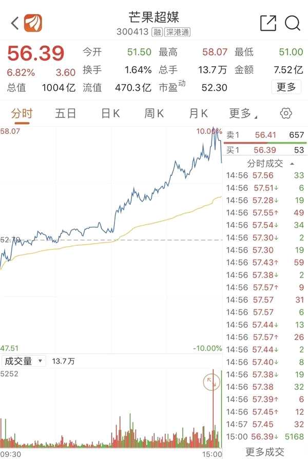 芒果超媒的股價表現(xiàn)也沒有辜負(fù)“浪姐”的努力。周五節(jié)目上線之后,芒果超媒股票股價午后一度漲停,并創(chuàng)出歷史新高。截至收盤,芒果超媒漲6.82%,報56.39元/股,總市值為1004億元。