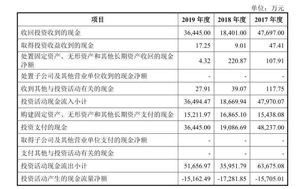 相對應(yīng)的是,報告期內(nèi),回音必購建固定資產(chǎn)等項目的現(xiàn)金流出分別為1.54億元、1.69億元和1.52億元。投資活動產(chǎn)生的現(xiàn)金流量凈額為-1.57億元、-1.73億元和-1.52億元。