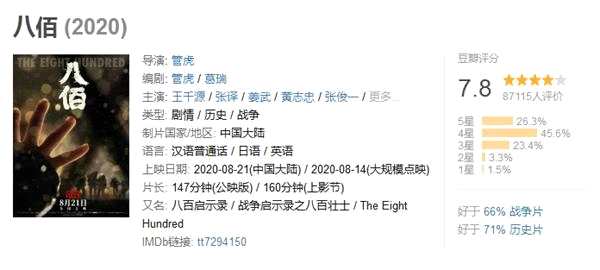 《八佰》電影內(nèi)容的背景是1937年滬淞?xí)?zhàn)的最后一役,“八百壯士”奉命堅(jiān)守上海四行倉(cāng)庫(kù),以少敵多抵抗四天四夜的故事,是亞洲首部全片使用IMAX攝影機(jī)拍攝的商業(yè)電影,豆瓣評(píng)分為7.8分。