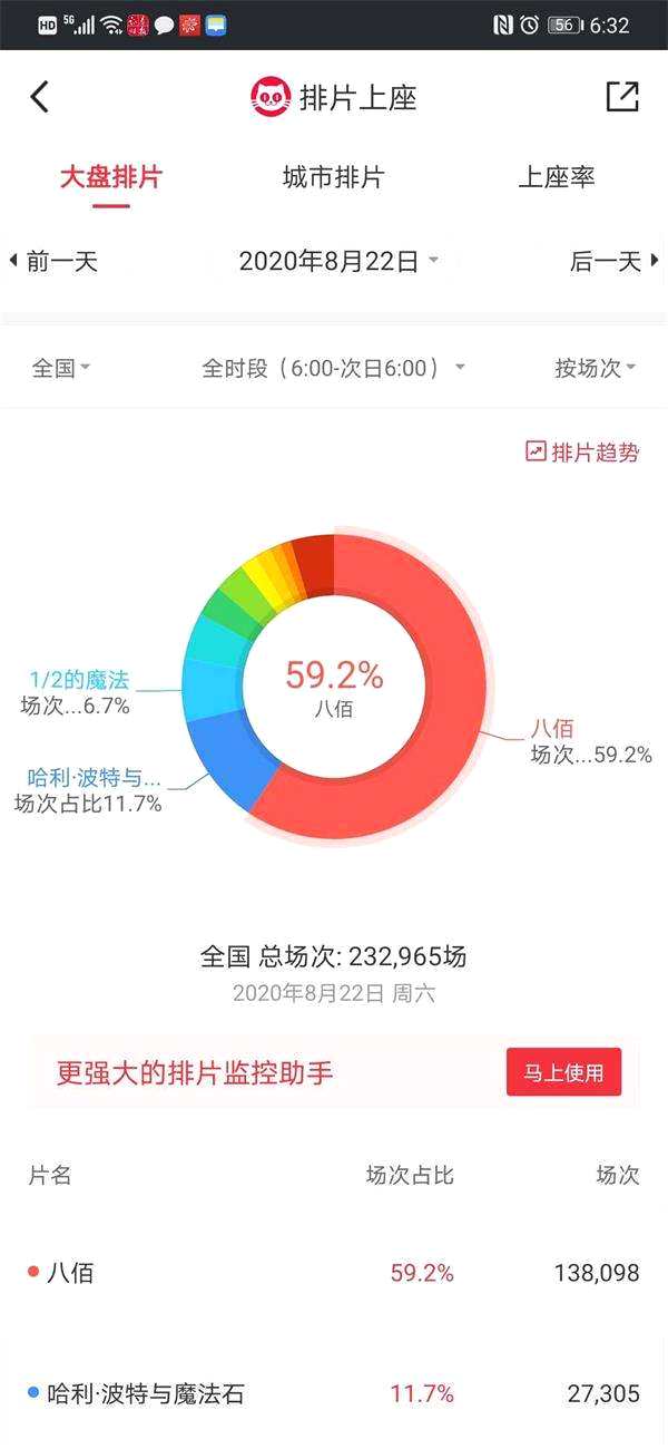 拍片方面,各大院線也似乎“獨(dú)寵”《八佰》,排片占比接近60%,遠(yuǎn)高于第二名票房的《哈利波特與魔法石》。