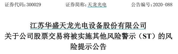 9月7日晚間,樂凱新材和天龍光電雙雙公告,由于“公司生產(chǎn)經(jīng)營活動受到嚴(yán)重影響且預(yù)計(jì)在三個月以內(nèi)不能恢復(fù)正常”,兩只股票將自9月12日起被實(shí)施其他風(fēng)險(xiǎn)警示。這意味著,創(chuàng)業(yè)板首批ST股票就要來了。