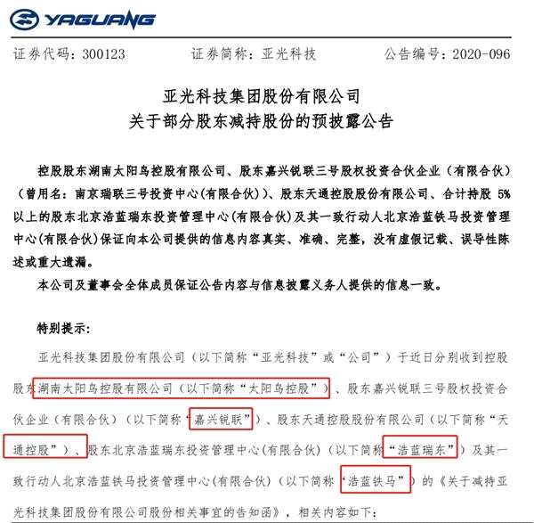 太陽(yáng)鳥控股擬減持的股份來源為通過非公開發(fā)行方式(發(fā)行股份購(gòu)買資產(chǎn))取得的股份且已解除限售條件的公司股份,和首次公開發(fā)行股票上市前持有的亞光科技股份(含該等股份因資本公積金轉(zhuǎn)增股本而相應(yīng)增加的股份);嘉興銳聯(lián)、天通股份、浩藍(lán)瑞東及浩藍(lán)鐵馬擬減持的股份來源為上市公司重大資產(chǎn)重組發(fā)行的非公開發(fā)行股份。