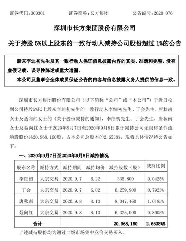 五連板長(zhǎng)方集團(tuán):多名股東累計(jì)減持2.6538%公司股份