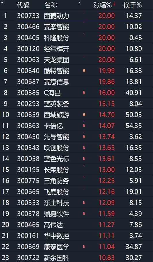 值得注意的是,多只創(chuàng)業(yè)板熱門股上午換手率暴增,10只個股上午換手率超30%,其中卡倍億、【西域旅游(300859)、股吧】超過50%。值得一提的是,已經(jīng)兩連板的卡倍億盤中一度三連板,臨近午盤打開漲停,午盤上漲14.07%,換手率達(dá)54.35%。